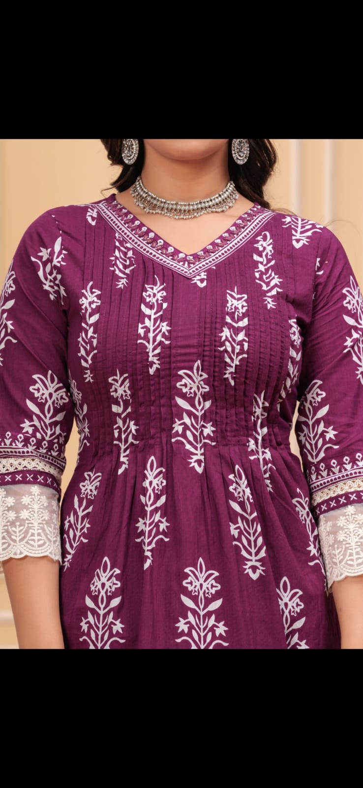 Graceful floral embroidered kurti featuring fine pleated front and intricate lace sleeves